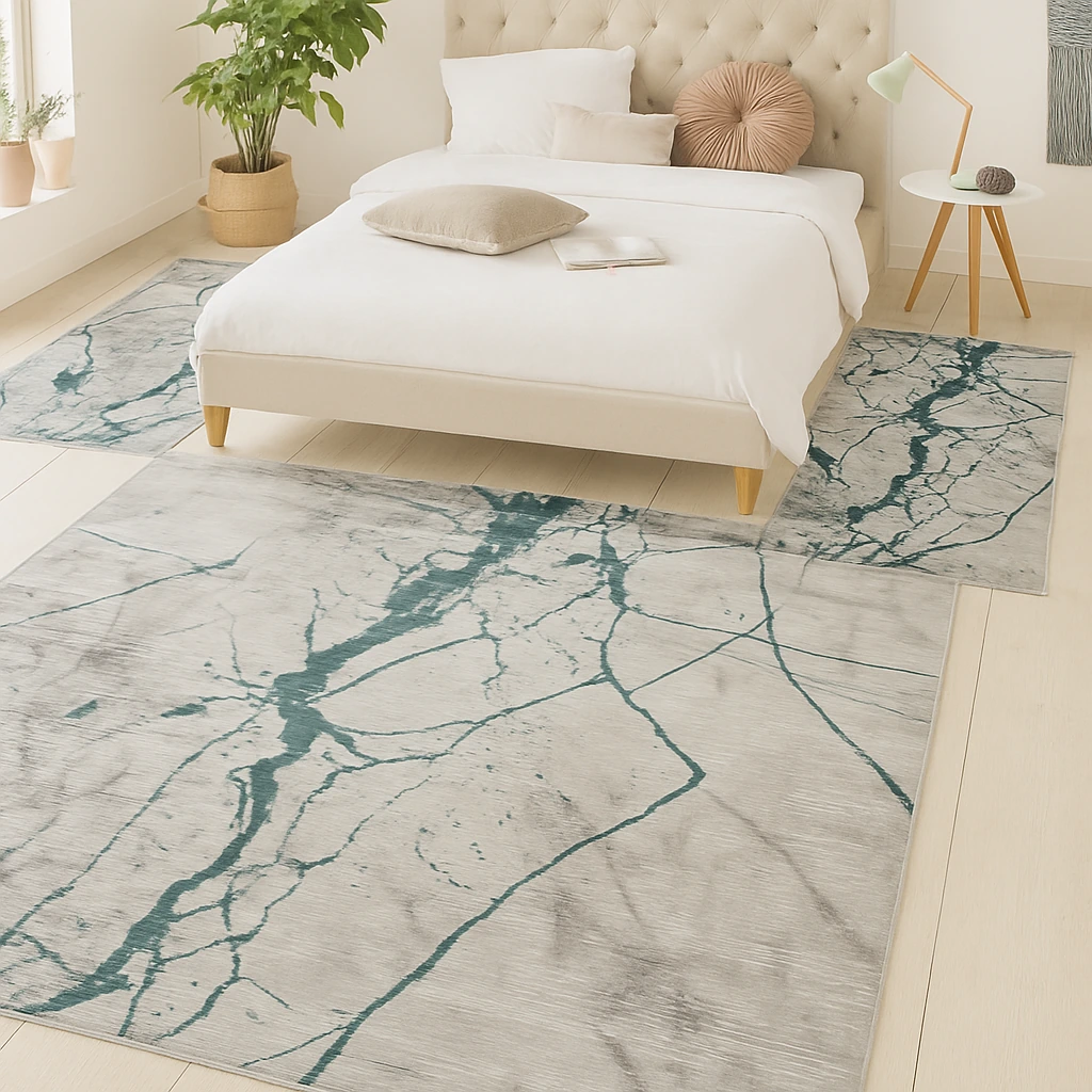 Fabricat din 60% polipropilena si 40% poliester, acest covor ofera o durabilitate excelenta si necesita intretinere minima. Textura sa placuta la atingere si imprimeurile subtile in nuante de gri si turcoaz adauga un plus de stil fara a incarca vizual spatiul. In plus, materialul este rezistent la pete si uzura, asigurandu-i un aspect impecabil pe termen lung.